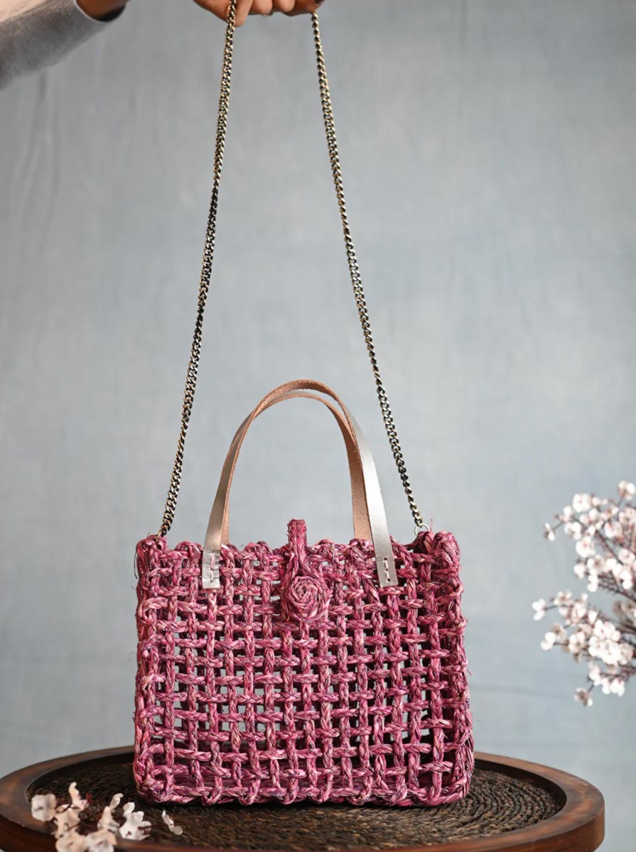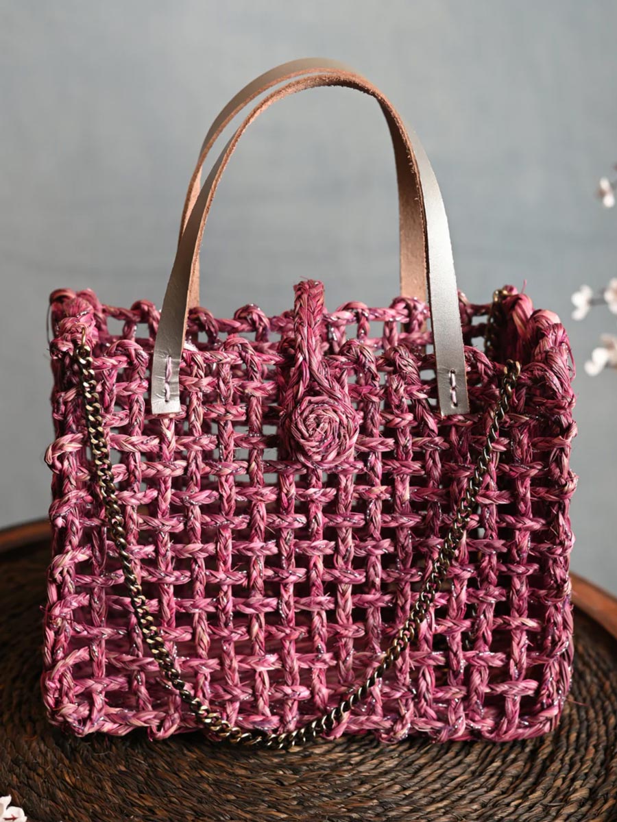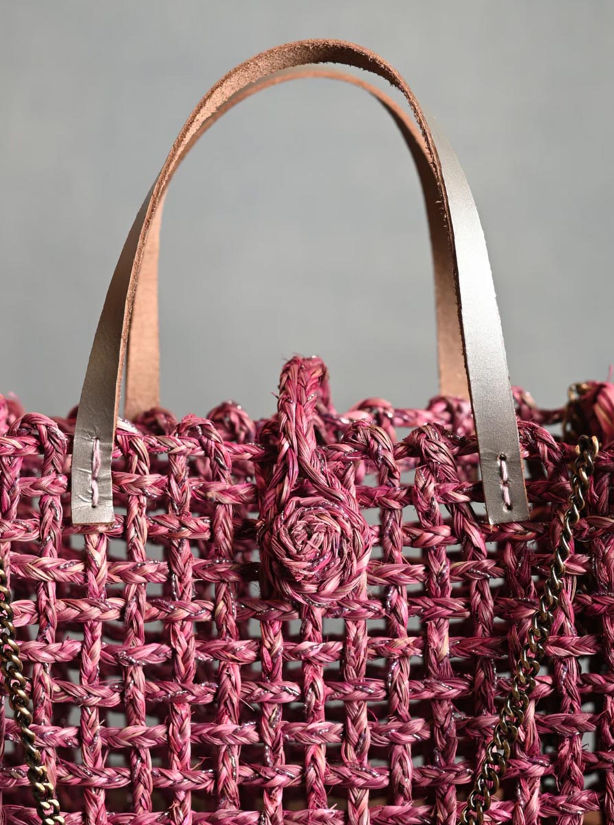 Die Mini Mesh Tasche besticht durch ihre kompakte Größe und ein elegantes Design. Hergestellt aus Sabai, ist diese Tasche modern und stilvoll. Sie wird mit einem praktischen Metallkette geliefert, die es Dir ermöglicht, die Tasche bequem über der Schulter oder quer über den Körper zu tragen – ideal, wenn Du die Hände frei haben möchtest und dennoch all Deine wichtigen Dinge griffbereit behalten willst. Um den Look zu vollenden, weben die Frauen einen silbernen Faden in das pink gefärbte Naturgras ein. Dieser silberne Faden passt wunderbar zu den silberfarbenen Leder-Hänkeln. Mach Dich bereit, mit diesem schicken Accessoire alle Blicke auf Dich zu ziehen!