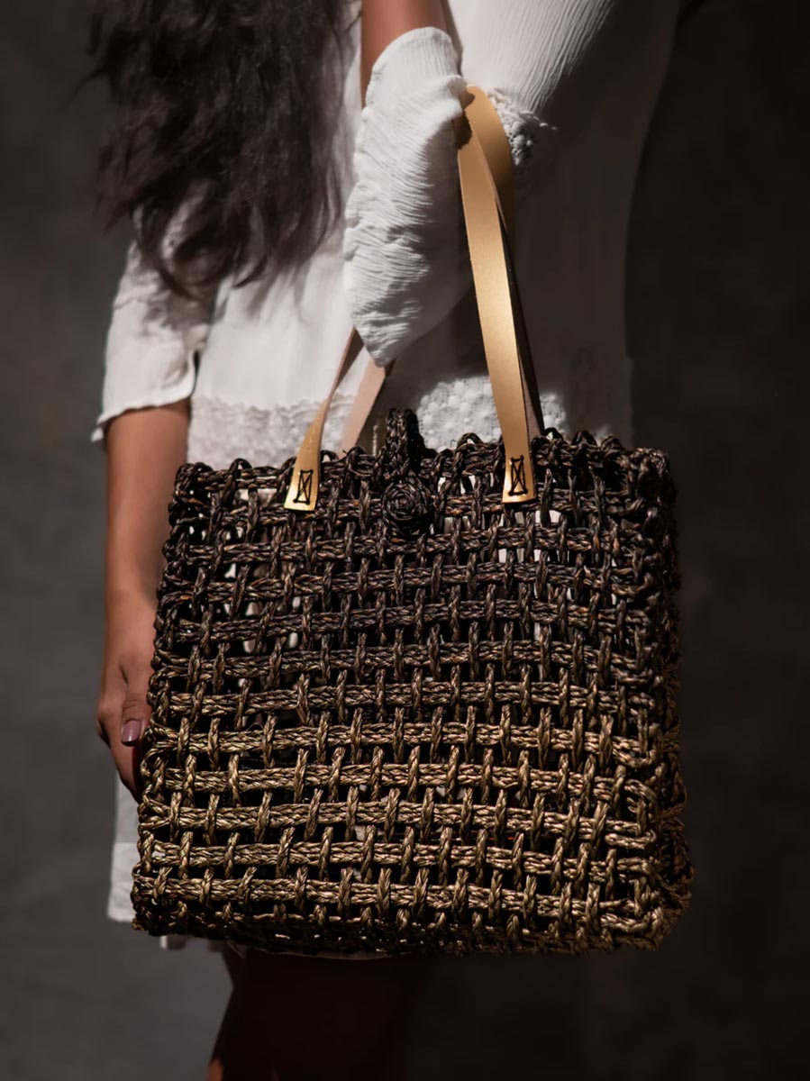 Jede Tasche wird von erfahrenen Kunsthandwerkern sorgfältig aus Sabai-Gras gefertigt, einer nachhaltigen und erneuerbaren Ressource, die in den Wäldern Indiens vorkommt. Die goldfarbenen Leder-Hänkel sind bequem über der Schulter zu tragen. Ob für die Arbeit mit Laptop, die Uni oder ein schickes Abendessen – die Tasche ist modisch und vielseitig einsetzbar. Die größere Variante eignet sich auch hervorragend als Einkaufstasche, um mehrere Gegenstände bequem zu transportieren.