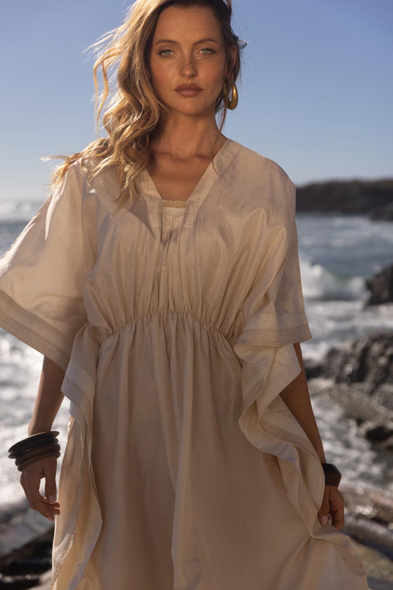Verkörpere die Essenz des Glücks mit dem handgefertigten einzigartigen Seidenkleid "Khushali" aus Indien.