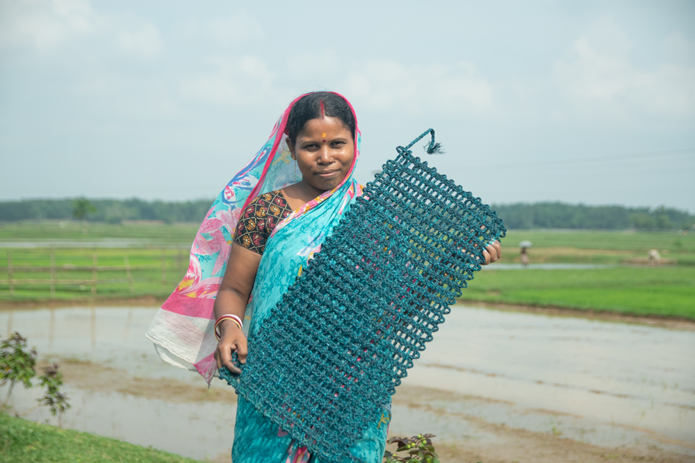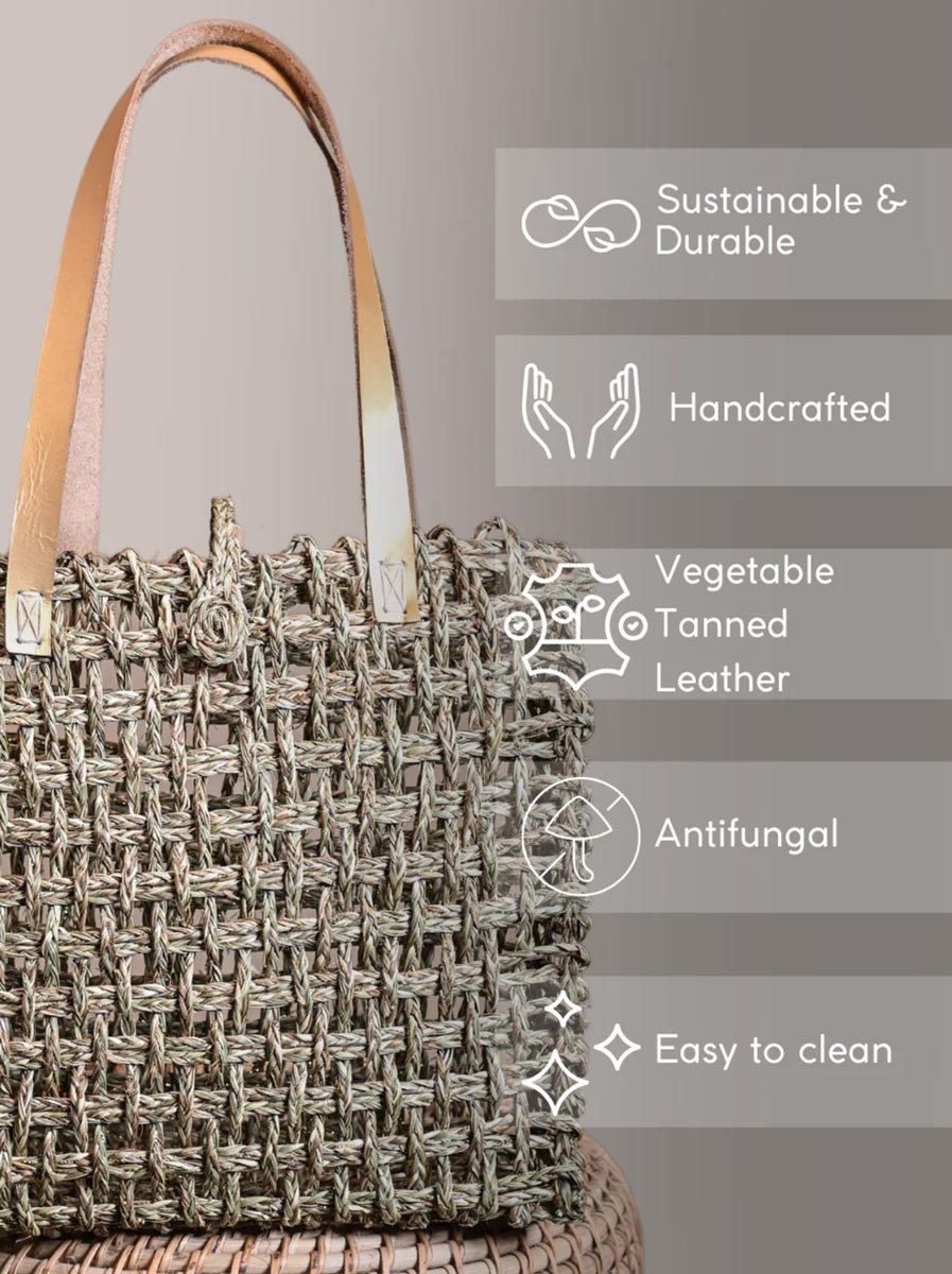 Jede Tasche wird von erfahrenen Kunsthandwerkern sorgfältig aus Sabai-Gras gefertigt, einer nachhaltigen und erneuerbaren Ressource, die in den Wäldern Indiens vorkommt.
